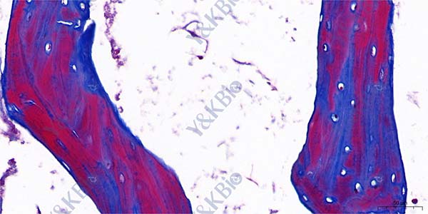 骨中胶原主要是I型胶原,成熟骨内蒙古Masson染色胶原着鲜红色,在新生骨走向成熟过程中表现为红-蓝相间现象,表明骨组织中胶原的成熟程度影响Masson的染色反应,可以用Masson染色来评价骨质的成熟程度,新生骨质红染少,成熟骨内红染多,即骨质越成熟,红染越多。同样也可以用此染色观察骨细胞和成骨细胞的活动状况,在细胞周围出现的蓝染胶原系新生部分,细胞周围蓝染区域的大小代表细胞的新近活动程度。