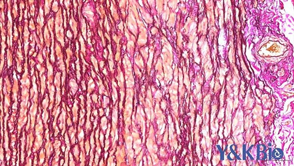 染色结果: 弹力纤维紫红色,胶原纤维红色,背景其他成分黄色