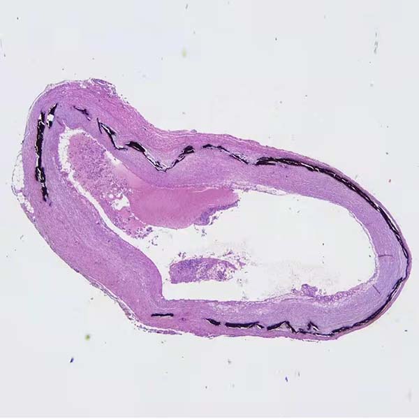 取另外一张连续切片脱蜡至水,置于Von Kossa对照液处理20min,流水冲洗5min.与实验片一同入Von Kossa硝酸银溶液,其余步骤同上。