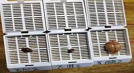 3、二甲苯透明:二甲苯1、二甲苯2、二甲苯3依次透明组织块,透明时间应控制好,透明后组织块呈半透明琥珀状为宜。